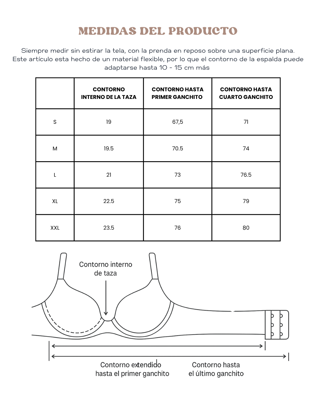 Sin embargo, es importante tener en cuenta que la taza no se estira: si bien es blandita, tiene un pequeño relieve interno tipo push up que le da forma y soporte, por lo que solo abarca hasta el talle que usás habitualmente de busto. Si tu talle de corpiño es mayor a un 105 (por ejemplo 110 o 115), este modelo no te va a brindar el calce adecuado en la parte del busto, aunque el contorno se adapte bien.